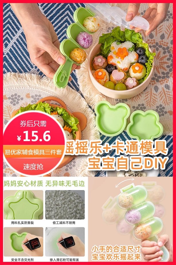 超级立减2.3元后约15.6元,易优家,辅食工具套装:饭团摇摇乐+卡通辅食模具+多功能料理勺,宝宝漏勺,辅食工具,食品级沥水勺,辅食泥研磨捞勺,一勺多用,为宝宝呈现更多美食,耐高温120℃,凸点小颗粒按压,轻松成泥,营养好吸收,宝宝吃饭香!