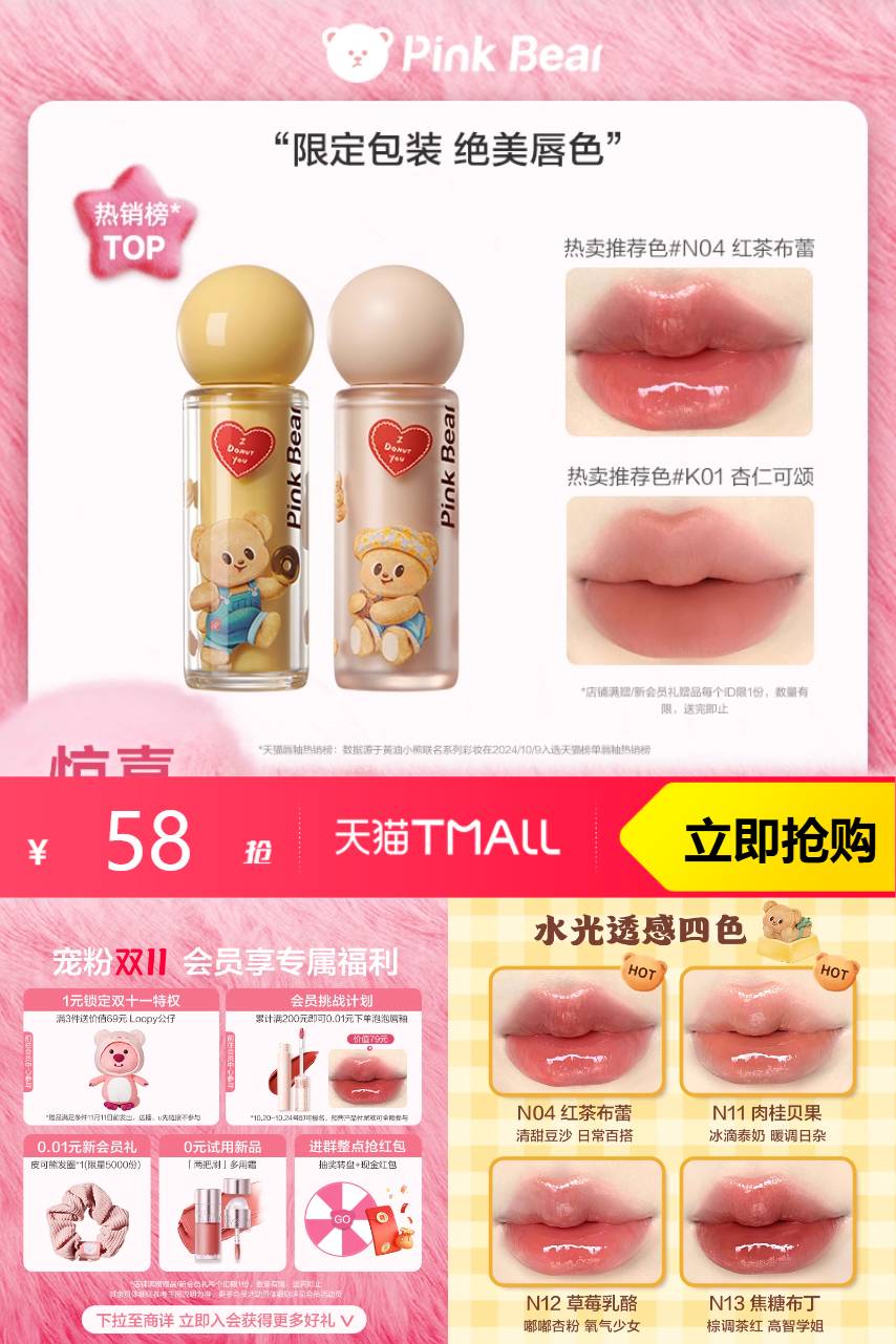 【拍3件到手58元,均价一只19.3】pinkbear皮可熊黄油小熊联名唇蜜精华蜜唇釉持色唇泥学生,到手三支!