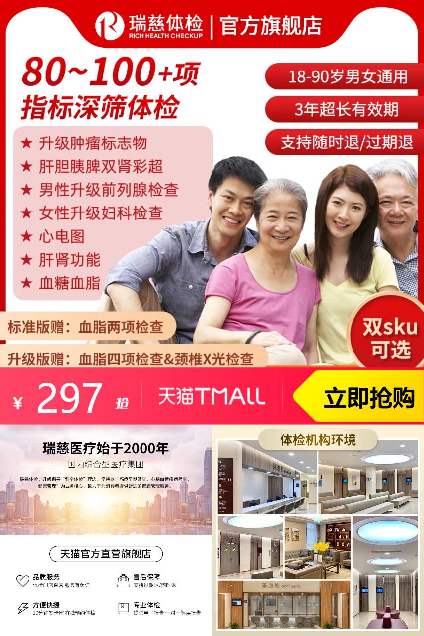 【原价1099-官方立减132-优惠券670-凑200减25-限时红包32=240到手】瑞慈福享全家健康D体检套餐升级版,定期做体检,中青年/中老年男女通用,为了您的身体健康,建议每年进行一次体检!