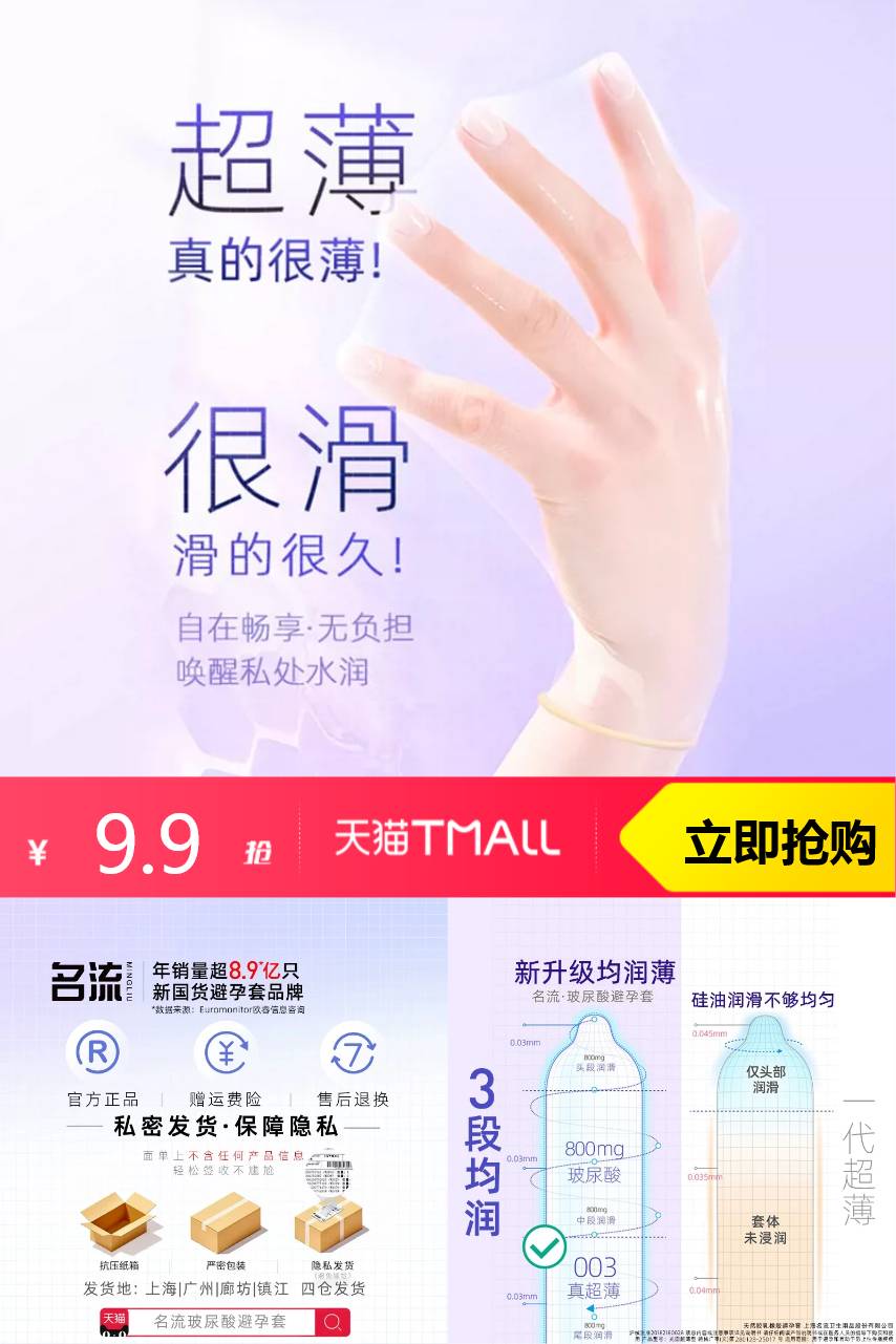 【新入会员减1元,0.01加购得两只无感薄】名流003玻尿酸避孕套正品超薄官方旗舰店男情趣延时安全套囤货装。