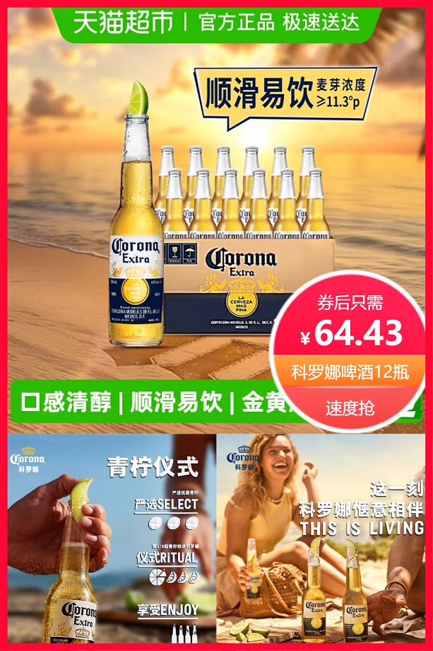 科罗娜墨西哥风味啤酒11.3度330ml*12瓶,超市补贴7元+立减33元+券5元+红包3元+点击右上角三个点进入淘金币抵扣9.57元+88vip省3.7元后约57.73元!麦芽浓度11.3度,口感清纯,色彩明亮!