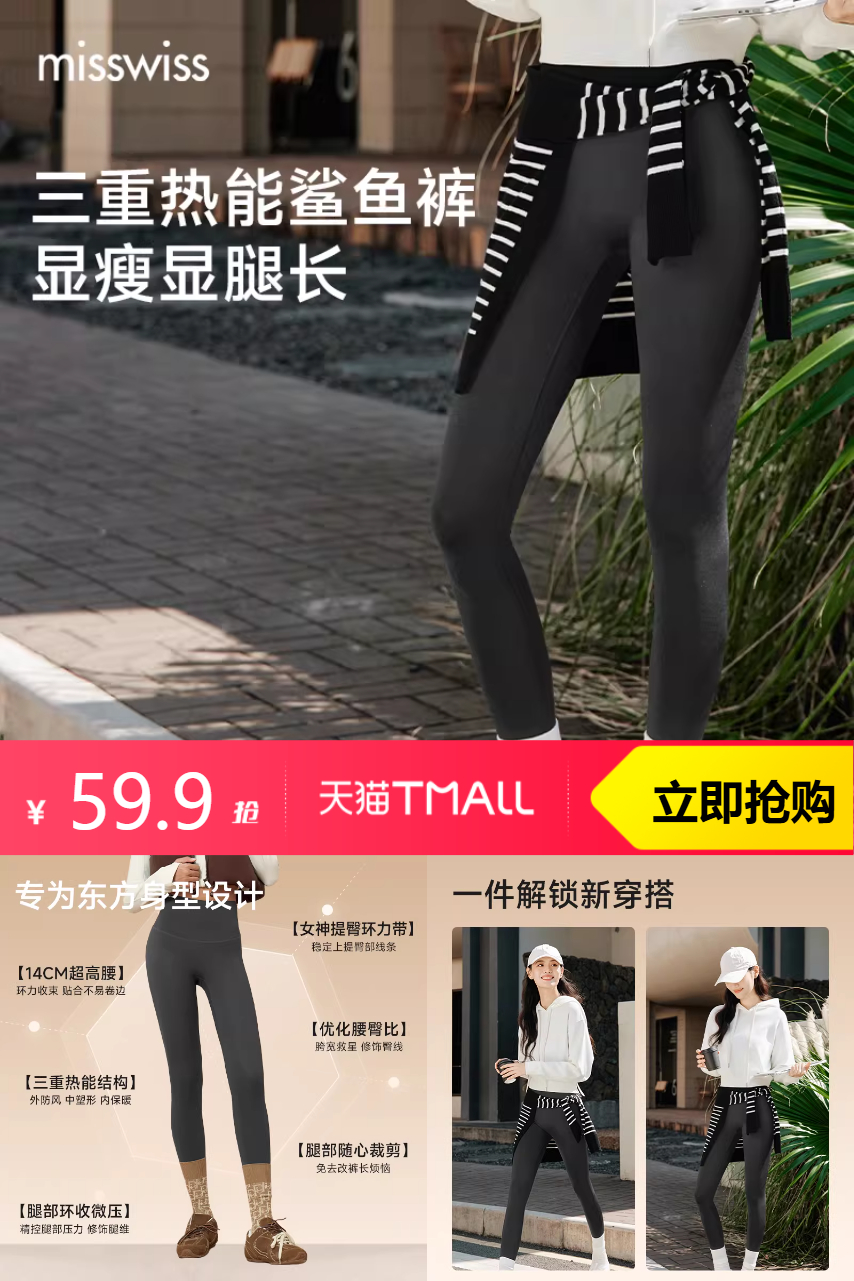 【有20%礼金抵扣11.98,领券减50,官方立减50,淘金币抵扣约7,叠消费券最终到手35左右,厚绒45,超厚绒55 多款任选都是史D价格】MissWiss鲨鱼裤女外穿秋冬加绒款,视觉打造细直长腿。一穿即凉,清爽透气。拒绝久坐汗湿黏腻、10cm高腰设计,抚平小腹紧塑腰线