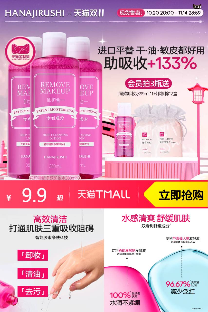【叠加88vip95折抵扣0.5元+淘金币1.78元+消费券9折=6.86元】花印卸妆水女眼唇脸三合一99ml,小小一瓶带出门旅行超方便!超多回购!!养肤型卸妆水,0酒精0香精0糖醇,眼唇全脸卸护一瓶搞定,水润舒缓温和亲肤,干敏肌闭眼入!!