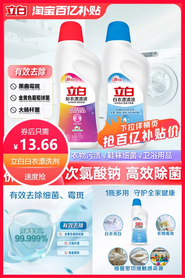 限时补贴10元+下拉详情淘金币抵扣1.24元后约13.66元更实惠,立白白衣彩衣漂渍液600g*2瓶,单瓶只需6.83元,含次氯酸成分,安心防疫,除顽渍除菌洁净,彩衣鲜艳,气味清新,快抢购吧!!