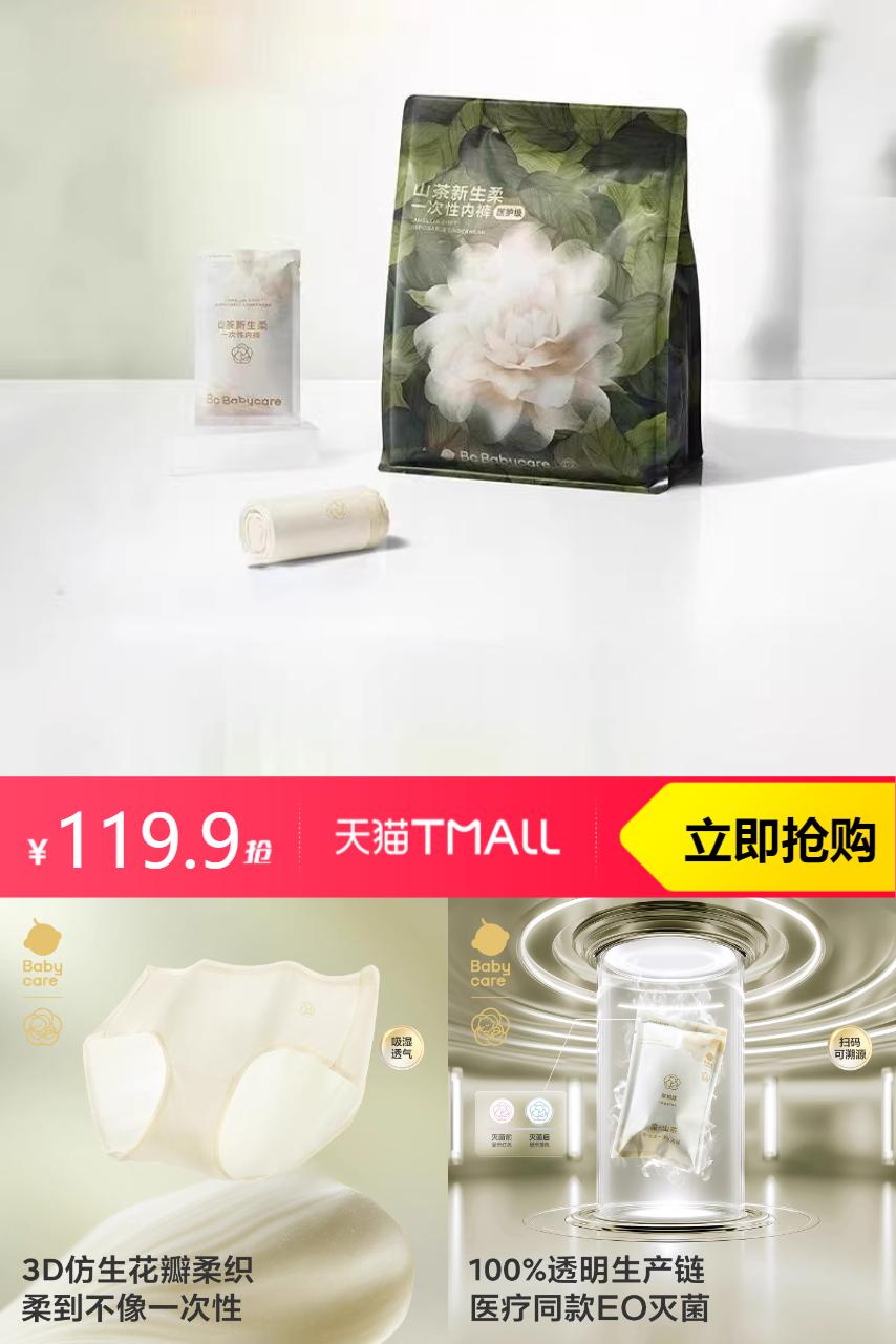 【百补119.9到手,叠加淘金币3.89+200-25消费劵到手102】babycare山茶花一次性内裤30条,独立包装中高腰设计仿真丝触感加宽版底档姐妹们快冲!!