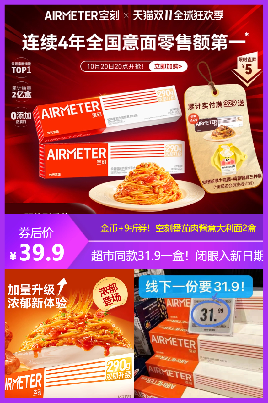 超市31.9一盒啊!咱9折券+淘金币抵扣后超低价到手!空刻意大利面经典番茄肉酱意面2盒,精选食材,舌尖上的清甜麦香,主厨特研美味随便做都好吃~