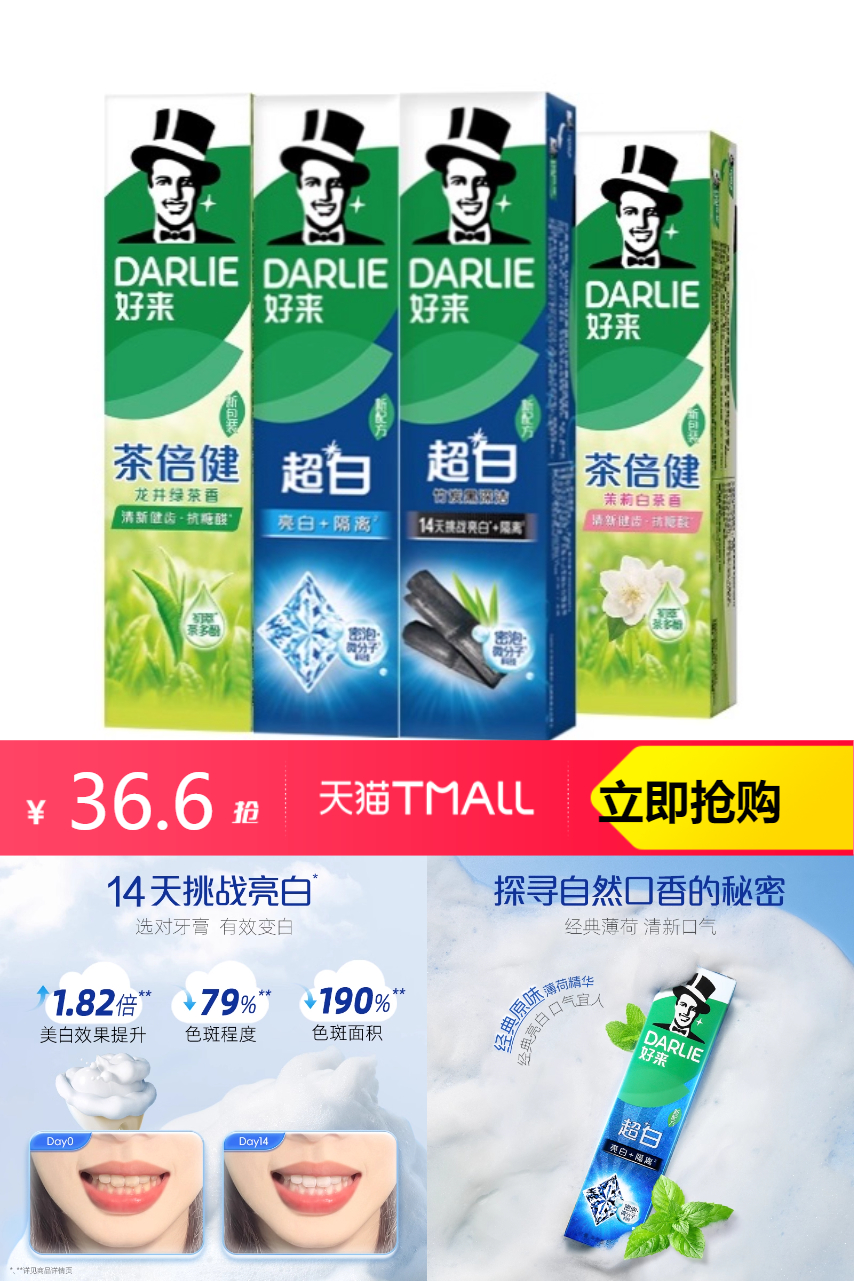 【叠加淘金币减3.28,88VIP抢闪购红包10减2,到手只要29.49元】好来牙膏超白茶家庭家用套装190g*4支,它的超白茶成分,能深入清洁牙齿,有效去除牙渍,让你的牙齿恢复自然白皙。