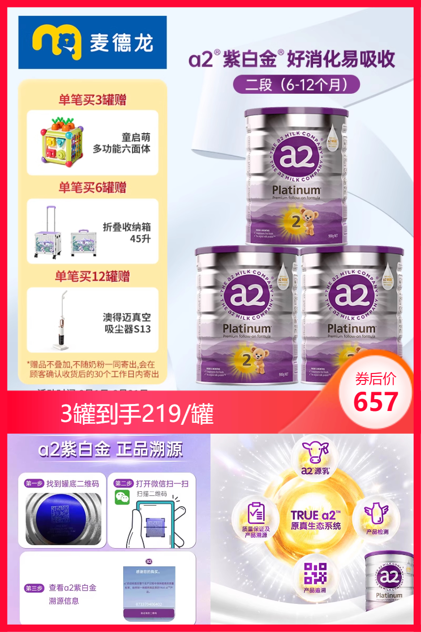 【3罐到手219/罐】麦德龙A2紫白金奶粉,专享新西兰产,护肠力MAX,营养全面升级!满载:A2蛋白,助长智脑力。一键解锁官方热线,解答疑问!适合6-12月宝贝喝~