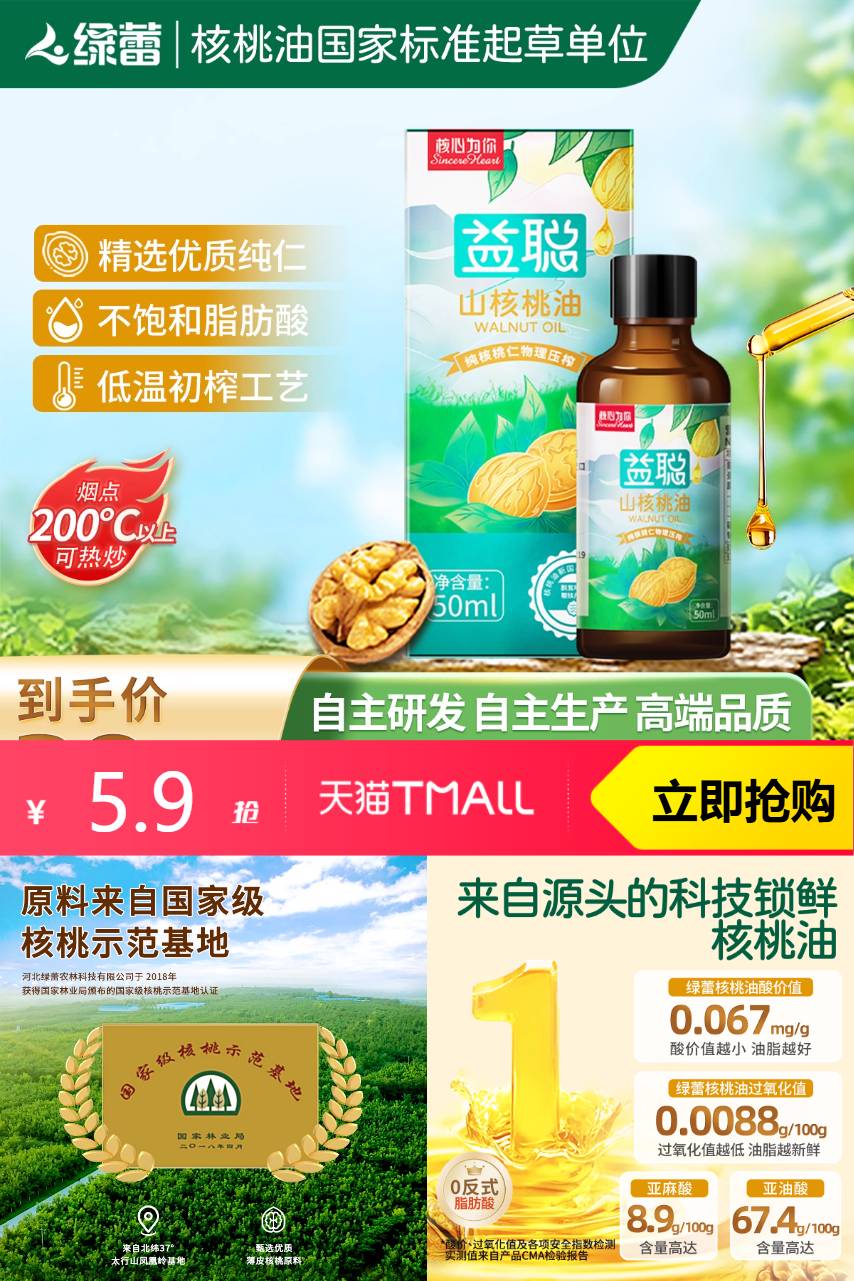 【送宝宝电子食谱】绿蕾儿童山核桃油50g,亚油酸、亚麻酸比例接近母乳,助力宝宝大脑飞速发育,让宝宝更聪明;丰富维生素E抗氧化,守护宝宝娇嫩肌肤。凉拌辅食,鲜香提味;低温热炒,营养不流失失。国家极准字号核桃油,无需担心,放心购买!