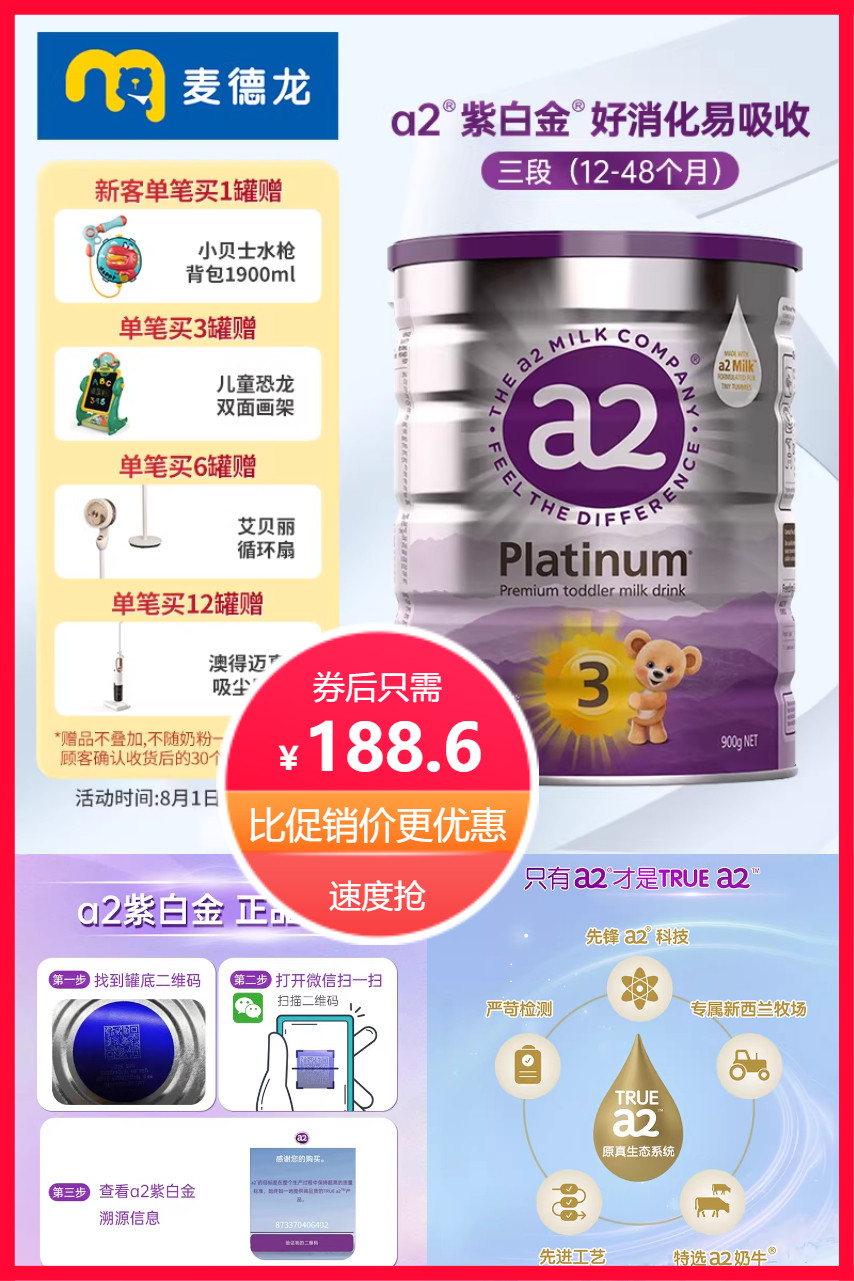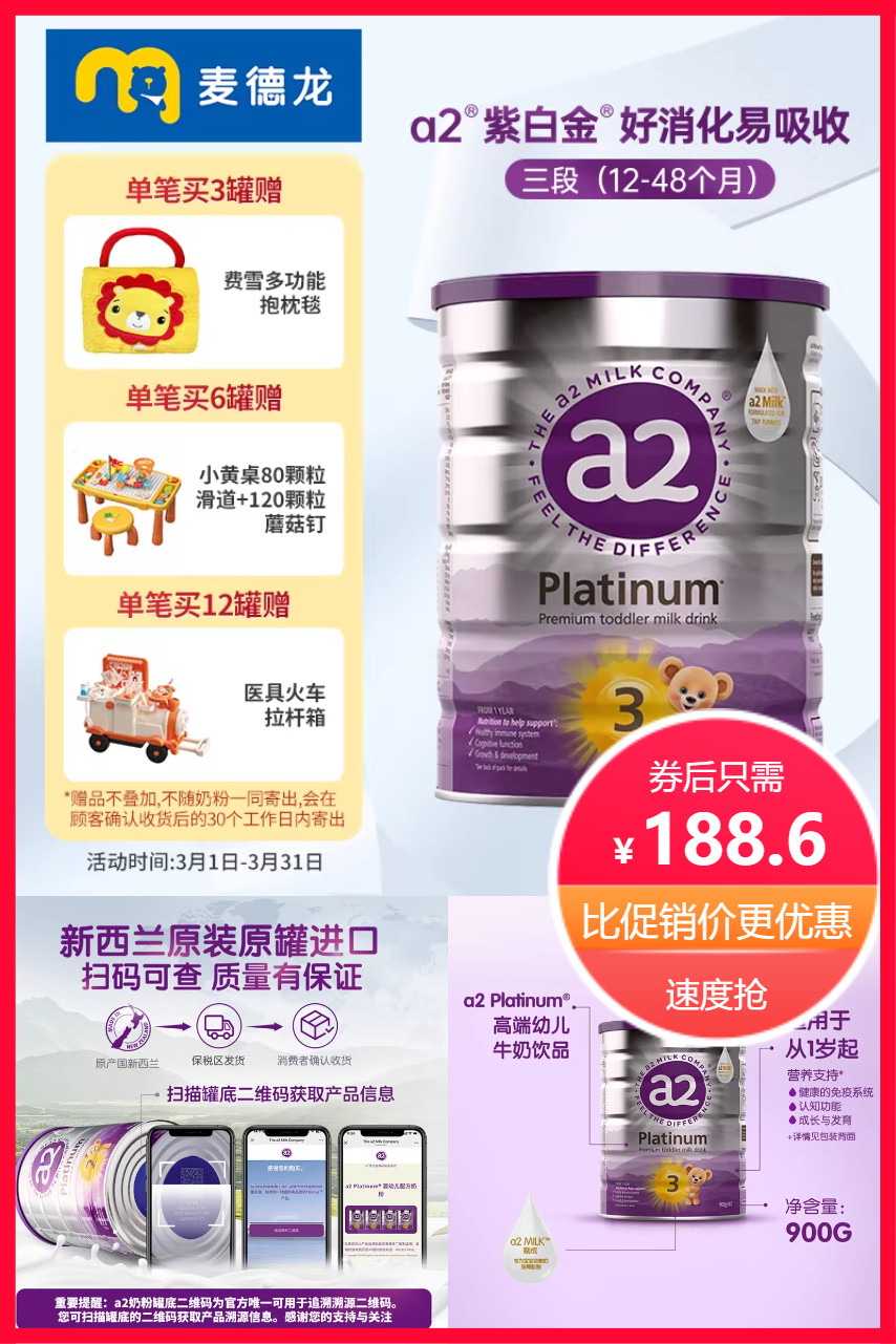 麦德龙A2紫白金奶粉,专享新西兰产,护肠力MAX,营养全面升级!满载:A2蛋白,助长智脑力。一键解锁官方热线,解答疑问!适合12-48个月宝贝喝~