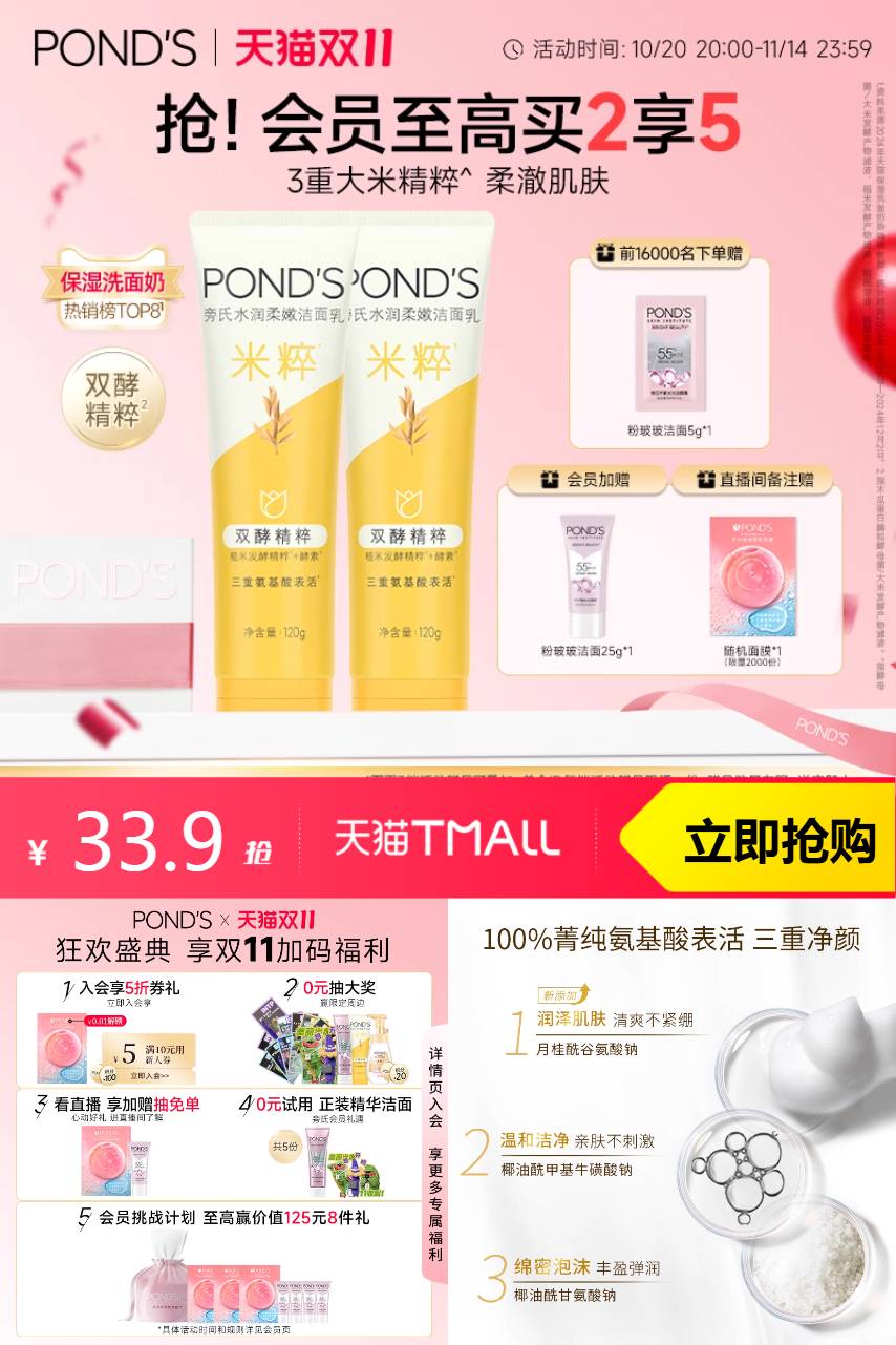 【1、叠加淘金币1元+消费券9折=29.61元。合计单支14.8元 2、前16000赠粉玻玻5g,自播间备注加赠随机面膜*1。会员再加赠粉玻玻25g】旁氏米粹洗面奶,平价国货!口碑爆款!含双酵精粹,百分百菁纯氨基酸表活三重净颜,润泽肌肤,泡沫绵密,温和不刺激,安心洁面,洁肤焕颜,清爽一夏~