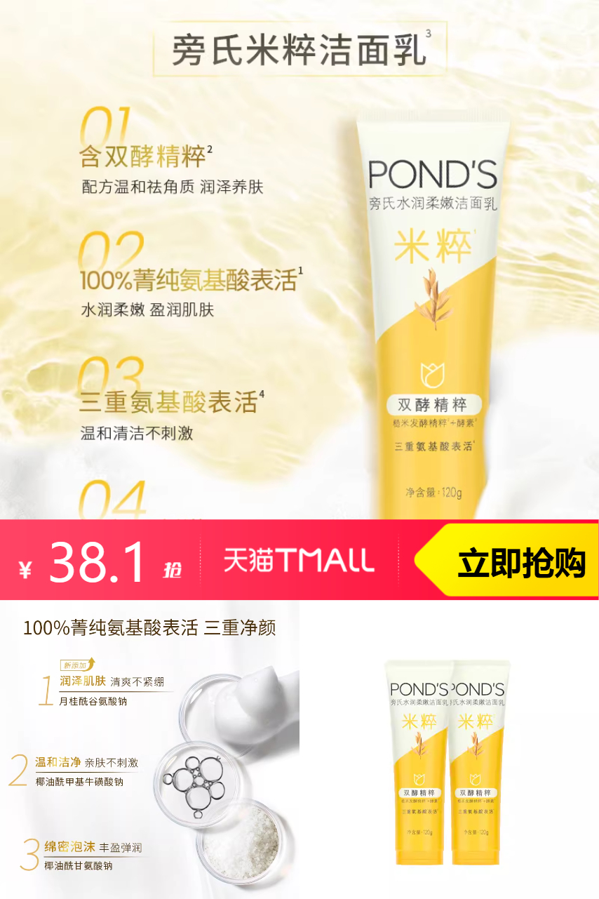【叠加淘金币1.47元+凑单消费券200-25=到手仅需32.05元。合计单支/16.02元,随机弹限时红包到手更低】旁氏米粹洗面奶120g*2支,平价国货!口碑爆款!含双酵精粹,百分百菁纯氨基酸表活三重净颜,润泽肌肤,泡沫绵密,温和不刺激,安心洁面,洁肤焕颜,清爽一夏~