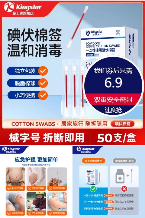 金士达医用碘伏棉签50支!碘伏+棉签二合一,一掰一折,消毒温和给力!!医用脱脂棉,棉头饱满吸液性强!!!双重安全密封,独立包装,卫生便携!!合格证书齐全,家庭必备!!【赠运费险】