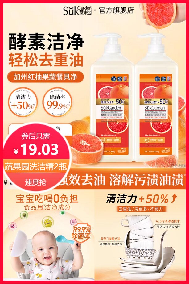 券26元+超级立减10.05元+立减2.49元+下拉详情淘金币抵扣4.87元+限时红包2元后约17.03元2瓶,单瓶只需9.5元,蔬果园家用食品级洗洁精,小红书千人种草安利~荣获多项优质品质多重认证,铺垫线下各大商超同款,果蔬+餐具2合1洁净,轻松去油污农残【甄选品质】【赠运费险】
