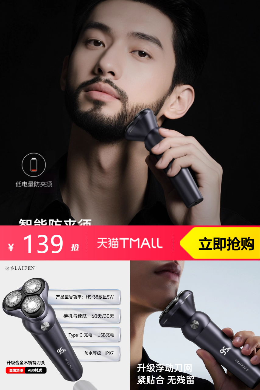 【原价299-立减36-优惠券124-淘金币6=133到手】握感舒适,剃须效果又快又好!全身可水洗,方便清理!