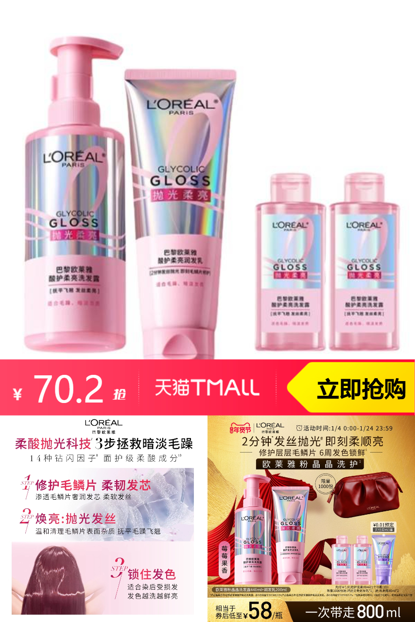 【1】立减10.3,淘金币入口抵扣2.56,首单礼金7元,凑精致生活券200-15,到手54.23; 【2】拍双支规格,赠旅行装80ml*2+限量1000份送化妆包*1欧莱雅粉晶晶洗发水洗护套装440ml,品质优选!
