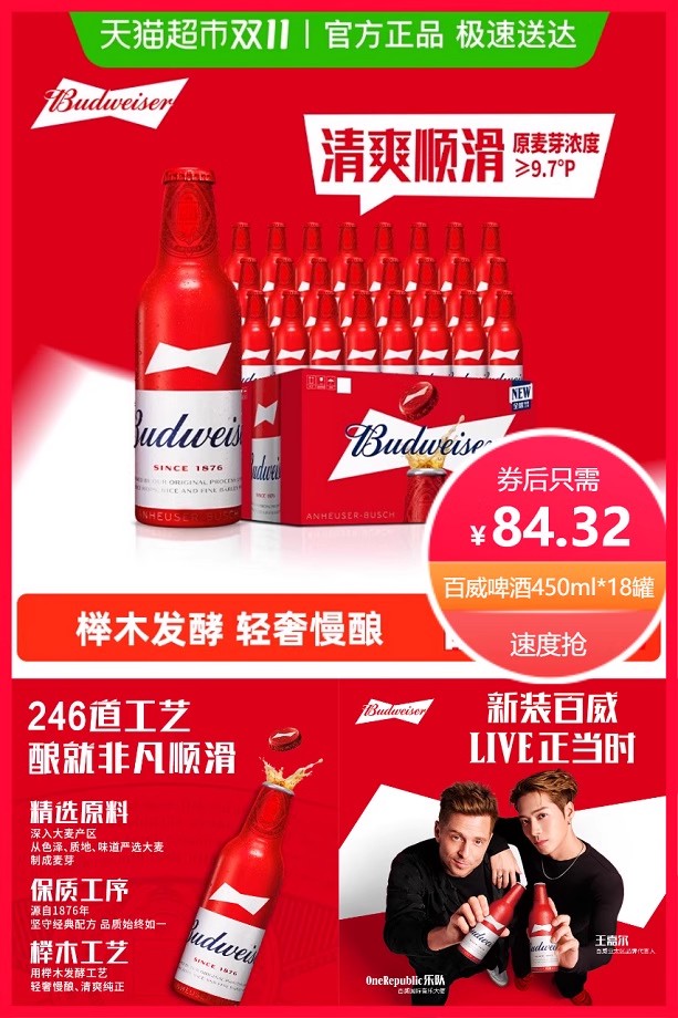 拍450ml*18罐,立减66元+红包10元+淘礼金省3.68元+券1元+点击右上角三个点进入淘金币抵扣9.18元后约64.54元,百威经典醇正拉格啤酒450ml*18罐,9.7°P整箱,精选原料,榉木发酵,轻奢慢酿,口感醇正,细腻顺滑,新装百威,庆祝正当时,朋友聚会来一杯,还得选百威!