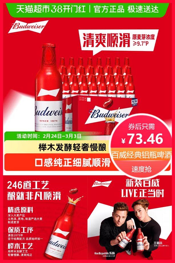 拍450ml*18罐,立减66元+券10元+点击右上角三个点进入淘金币抵扣9.54元+88vip省4.15元后约69.31元,百威经典醇正拉格啤酒450ml*18罐,9.7°P整箱,精选原料,榉木发酵,轻奢慢酿,口感醇正,细腻顺滑,新装百威,庆祝正当时,朋友聚会来一杯,还得选百威!