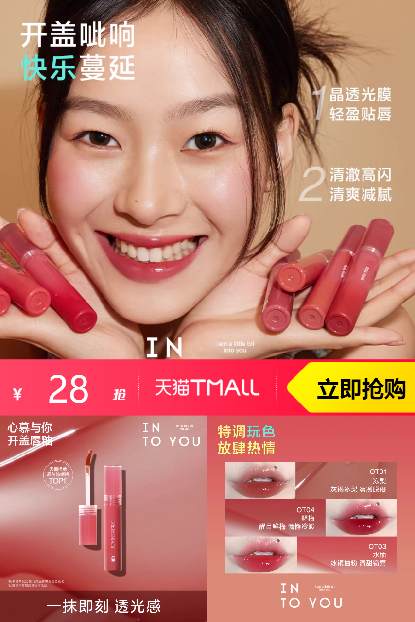【淘金币抵扣0.8,13.6/支】INTOYOU镜面水光唇釉,纯欲天花板,显白显气色,黄黑皮友好,日常通勤必备!