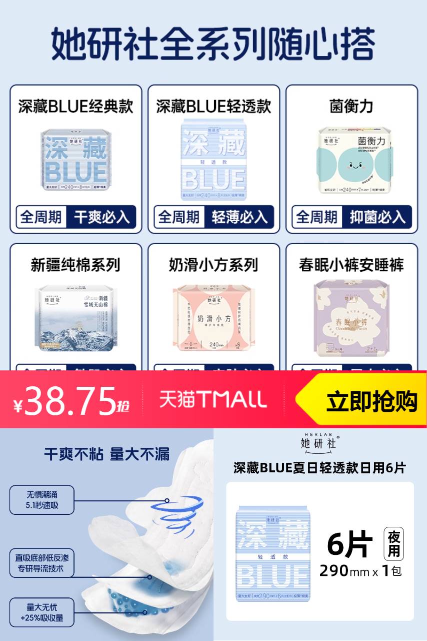 【【任选5件】优惠前79.5元-满5件5折-1元券=38.75元,叠加88vip95折减1.94元,淘金币可抵2.07元,到手34.74元】【满5件5折】她研社卫生巾日用夜用随心配,更透气 清爽不闷热,更干爽 潮涌不黏腻~
