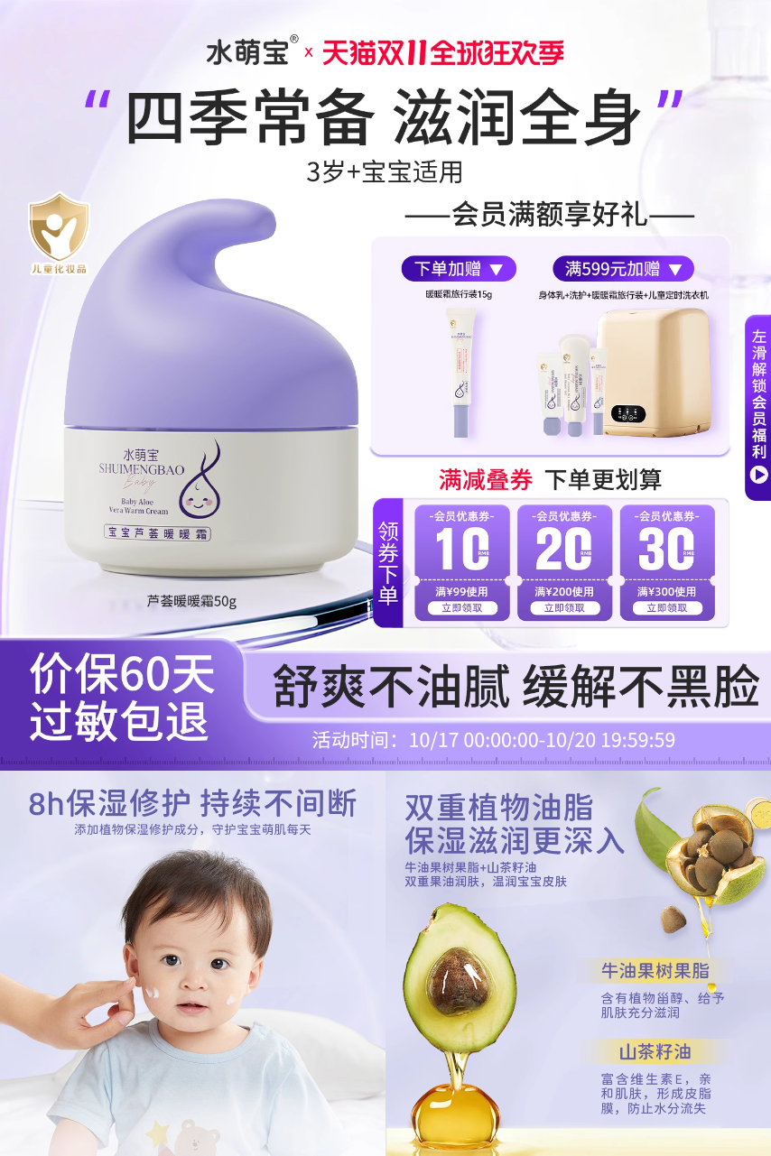 水萌宝芦荟暖暖面霜,天然修护,8h加倍保湿,温和无刺激,双重植物油脂,保护宝宝肌肤屏障,水润保湿不油腻,解决宝宝换季敏感干痒红皴裂等问题!1万多家合作门店,百万妈妈的共同选择!