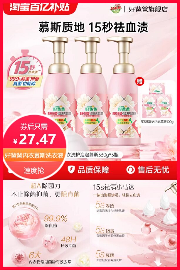 【买就送内衣慕斯100g*1到手430g,淘金币抵扣1.43元+限时红包3元后约24.47元】好爸爸高端慕斯洗衣液,亲肤0添加,有效祛除内衣物常见菌种,48小时长效抑菌,除菌除螨,15秒轻松洗掉血渍,有效祛除7天陈旧血渍,污渍,净享轻松白在~