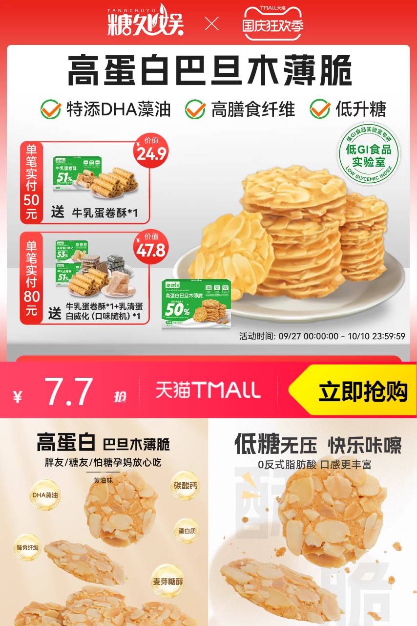 【叠加淘金币抵扣0.8元,到手价低至6.8元】高蛋白巴旦木薄脆,胖友/糖友/怕糖孕妈放心吃,减碳无压力控糖更容易!