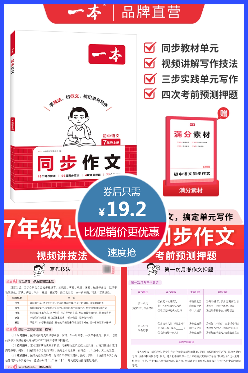 送满分素材!到手19.2元!一本初中通用七年级上册同步作文,同步教材单元,视频讲解写作技法,三步实践单元写作,四次考前预测押题,学技法,仿范文,搞定单元写作,语文同步作文!