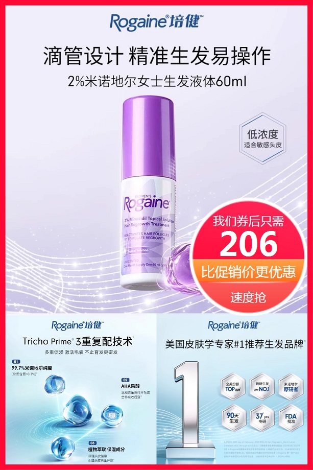 【立减33元】2%米诺地尔女士生发液体60ml,滴管设计,精准生发易操作。37"年专研技术通过临床数据验证。坚持24周发量暴增300%。专治脂溢性脱发,帮助调理维持健康头发,创造头发再生环境~