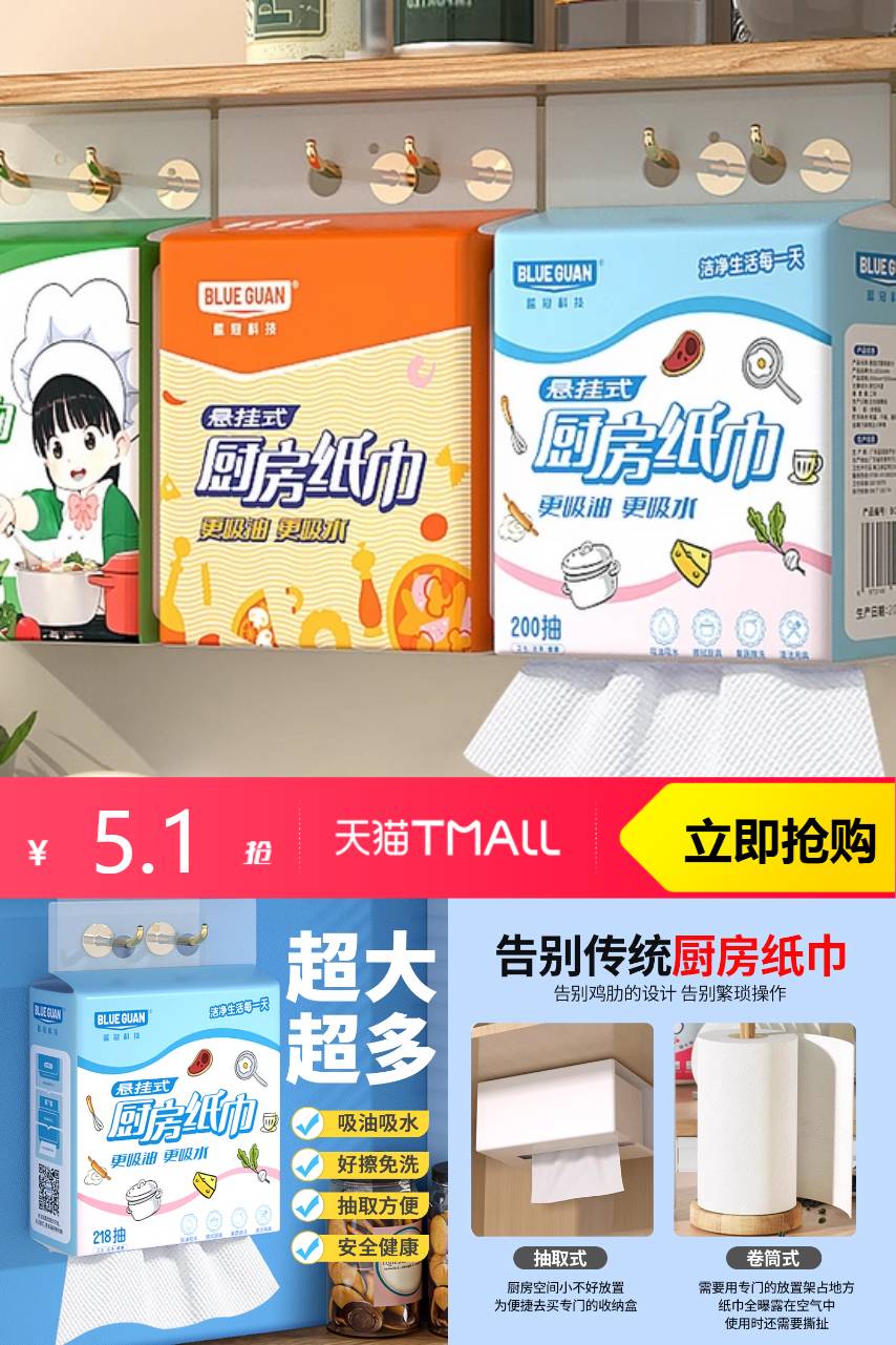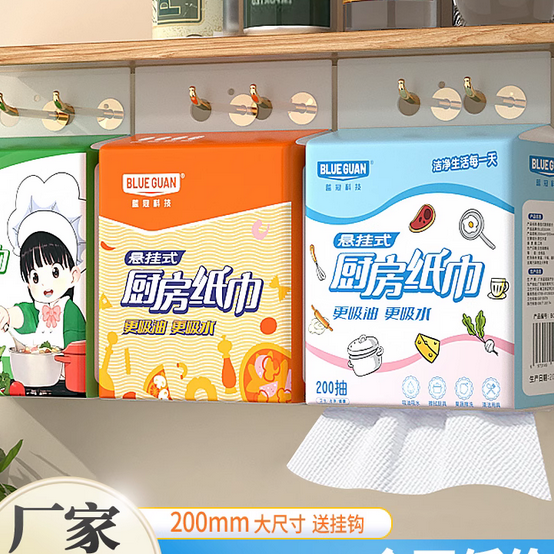 【原价7.1,领券立减2元,淘金币抵扣0.63,到手仅需4.47元】蓝冠1提厨房纸巾悬挂抽取式200抽, 清晰抽取体验,强力吸油吸水,200抽大容量,品质保证,无论厨房烹饪还是餐桌擦拭,蓝冠纸巾都是你品质生活的必备之选。选择蓝冠,让生活更美好!