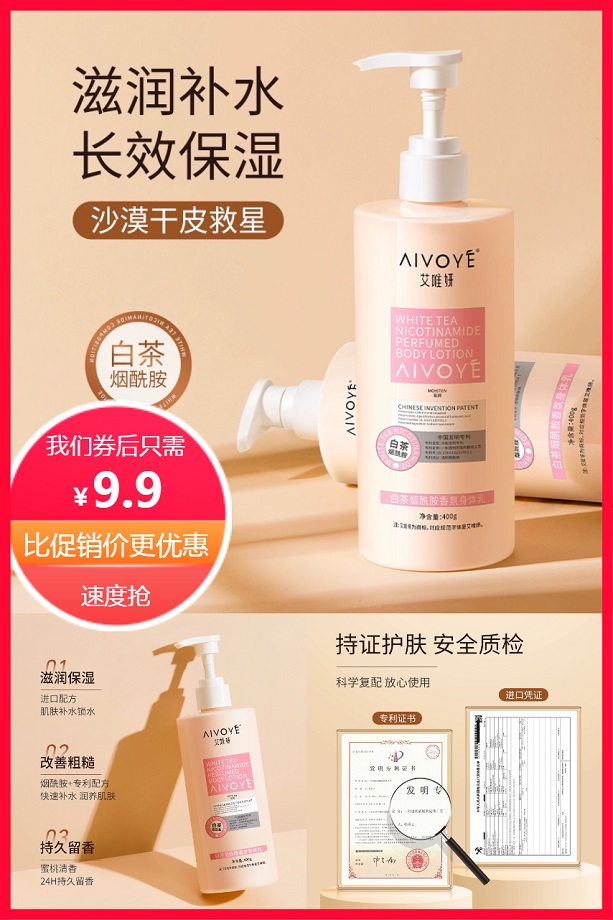 【9.9元秒!】大容量400g,滋润补水,长效保湿,沙漠干皮救星!烟酰胺+专利配方,快速补水,润养肌肤。清爽肤感,轻盈不粘衣。蜜桃清香,24H持久留香
