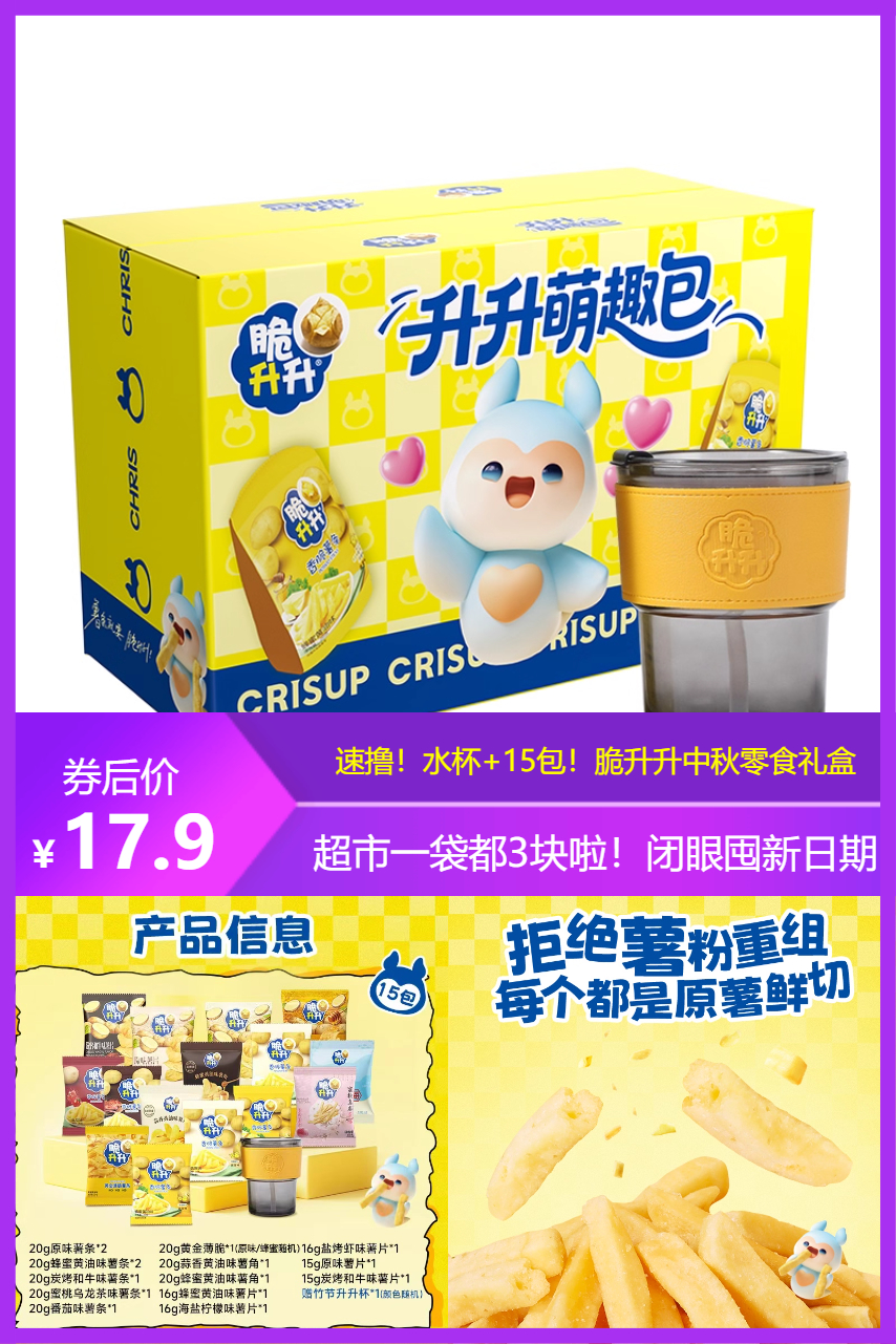 下单即赠升升杯1个! 脆升升食品旗舰店•升升萌趣包278g 百亿补贴17.9亓 满满一大箱里面足足15袋零食!!每一口都嘎嘣脆 关键还是0反式脂肪的,kuku炫也没啥负担