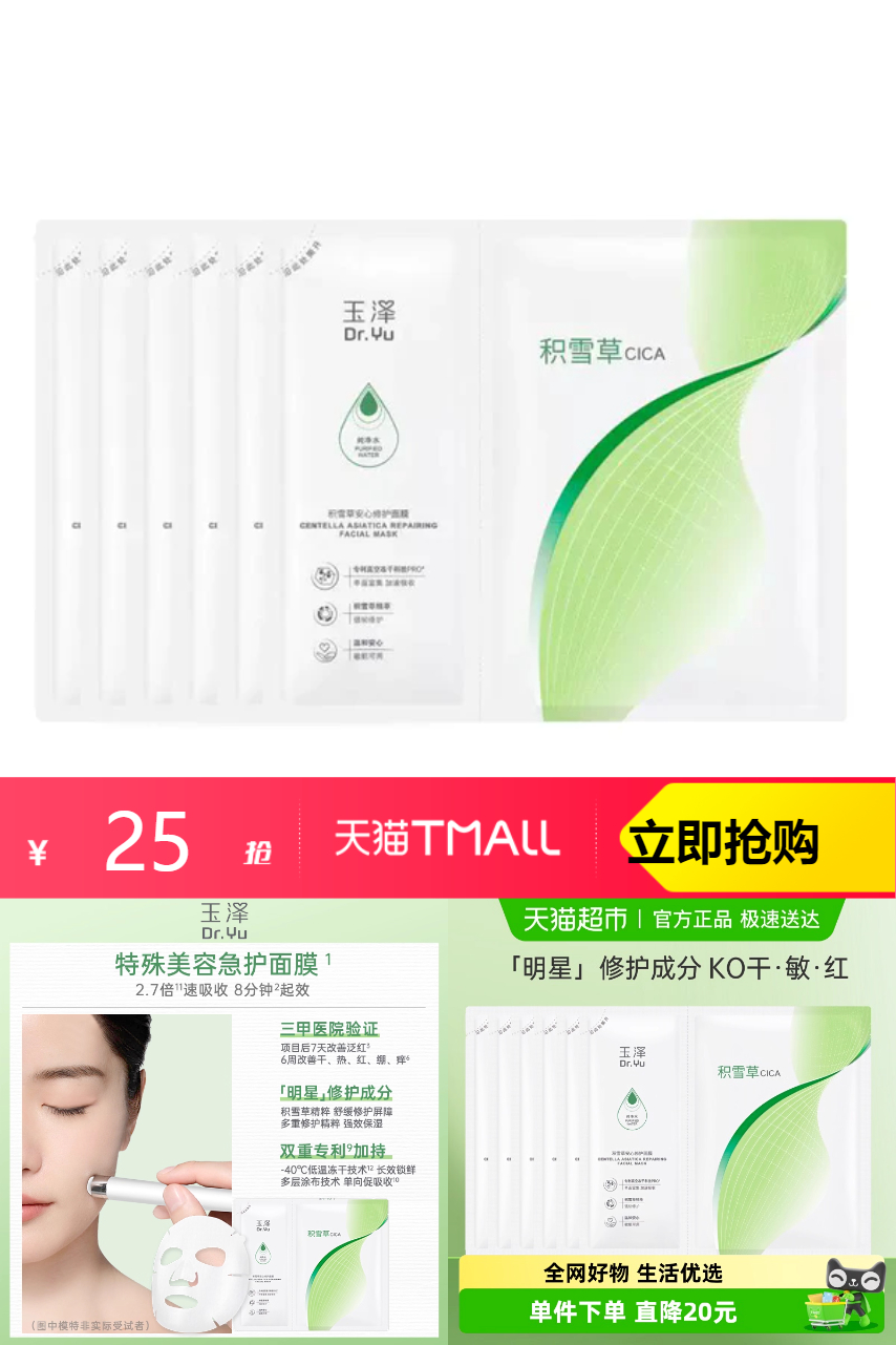 【叠加淘金币减2.19元,88vip到手21.7】玉泽积雪草安心修护面膜6片舒缓补水保湿,产品直击痛点:肌肤缺水、敏感泛红、换季不适,这些问题不再困扰您!我们的面膜采用天然积雪草提取物,为肌肤注入源源不断的水分和养分。
