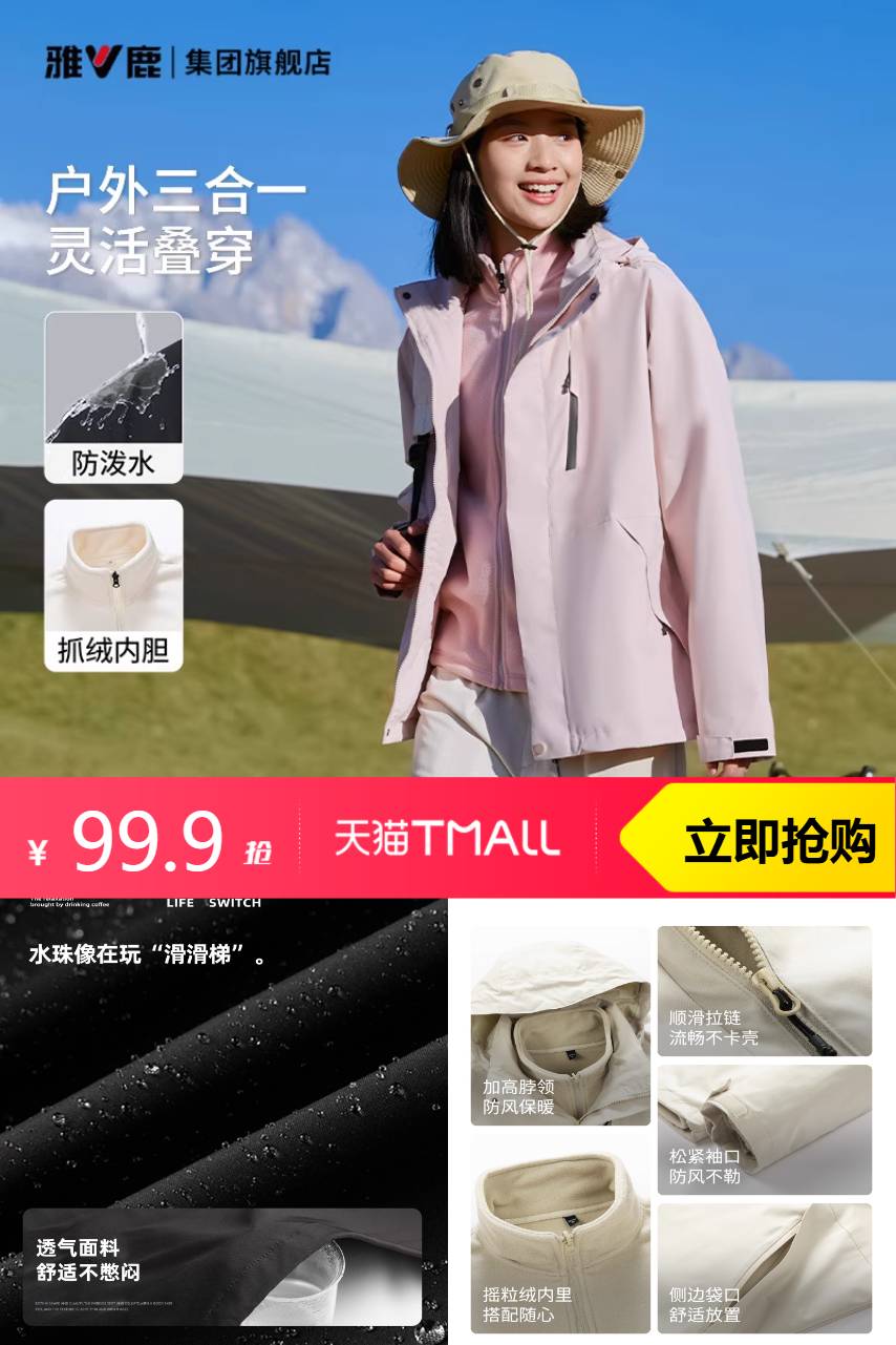 ⭕雅鹿三合一冲锋夹克外套男女秋冬加绒内胆