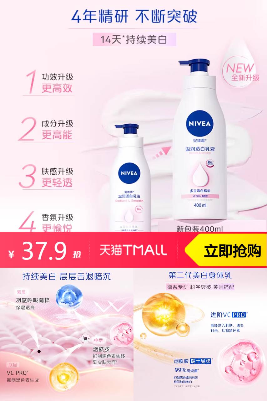 【1、直降16.7元,券5元,淘金币1元,新客2元,凑超市券199-35抵10元,叠9折券 88vip到手20元2、赠30ml小样*2】妮维雅第二代「大白瓶」身体乳,进阶VC Pro'14天*持续美白~