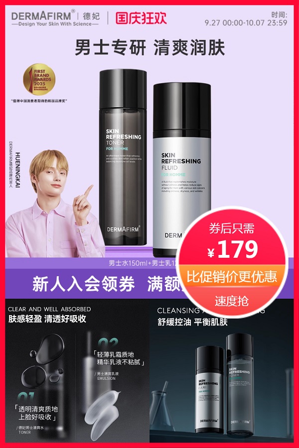 德妃水乳套装专为男士设计!补水保湿+控油舒缓双效合一,肌肤清爽不粘腻洗脸后也能持久水润~温和配方适合多种肤质,早晚用都舒服,护肤一步到位超省心!