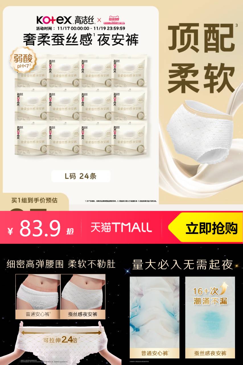 【淘金币抵扣1.5,领券减58,官方立减26后到手83.9 元,叠200-20消费券到手到手74左右,一共24条蚕丝感夜安裤】高洁丝8条装奢柔蚕丝感夜安裤,采用蚕丝般柔软的材质,贴身而不紧绷,给你如丝般顺滑的触感。