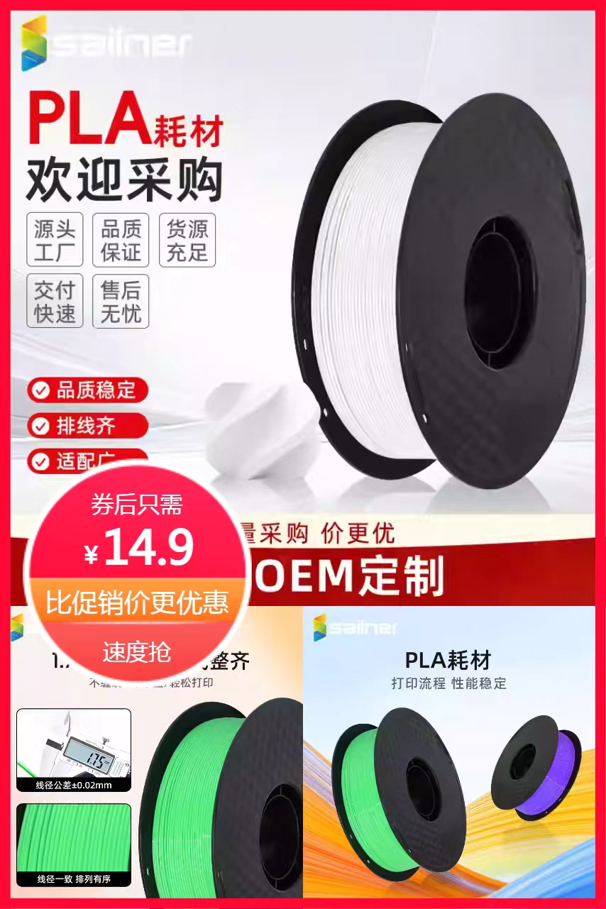 pla3d打印耗材,进口材料,适配百分之99以上的fdm设备,低收缩率,光泽度高,可降解原料,环保材料,绿色安全,打印不易翘曲,排线整齐,性能稳定,丝滑成型,高韧性,打印质量高,不堵头不翘边,粘结特性佳,质感丰富多色可选,应用场景广,满足不同创意需求,速抢