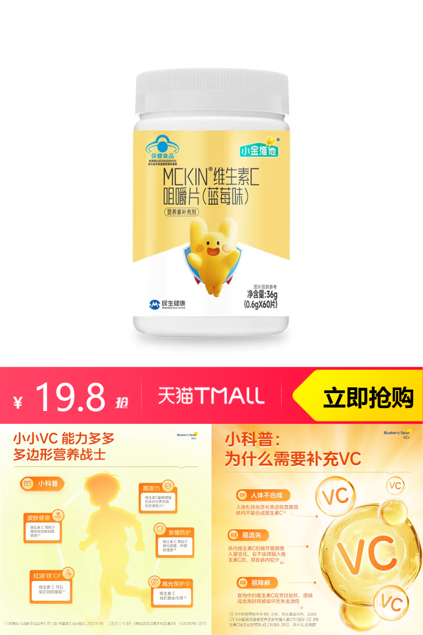【叠淘金币到手19.4元,折合9.7元/件】换季必备,吃起来酸酸甜甜的,可以很好的提升孩子的抵抗力,0添防腐剂,0人工色素,咀嚼服用非常方便,每片含维生素C80mg,蓝帽认证,老国民品牌