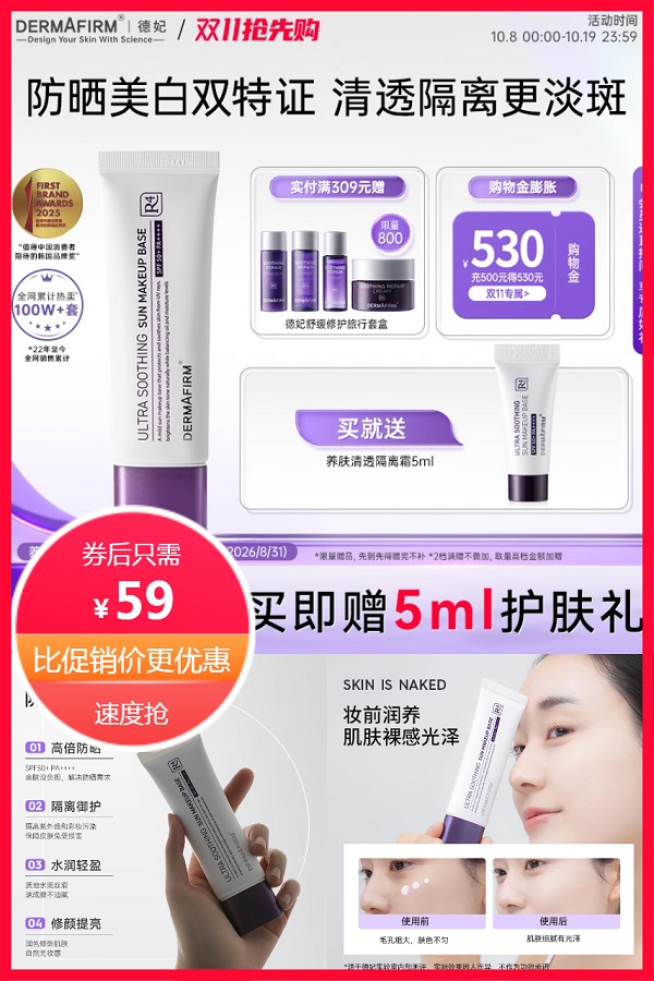【买就送养肤清透隔离霜5ml】德妃紫苏白隔离50g!SPF50++物理防晒,提亮遮瑕养肤三合一,素颜也能透出好气色~妆前打底不搓泥,清透不闷痘,敏感肌也安心用!