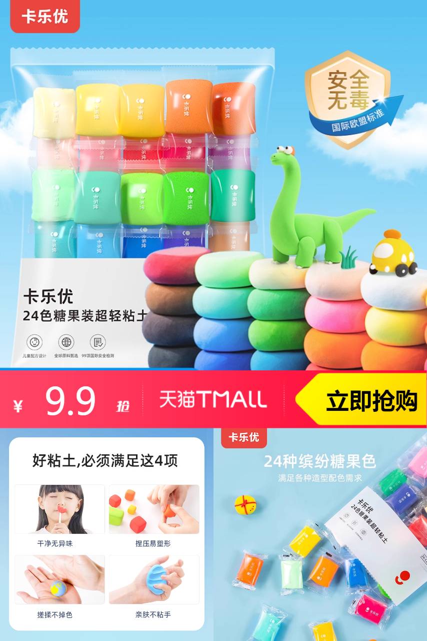 【叠加淘金币0.8元到手9.1元。】24色超轻粘土,欧盟标准安全无毒!儿童专享!优质原料手感细腻,激发创意!多彩24色随心搭配,创造无限可能!发掘宝贝的小小艺术家潜能,马上行动吧!