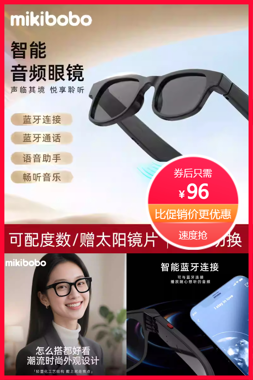 【淘金币抵扣到手约88.6元】】智能音频眼镜,声临其境,悦享聆听,智能蓝牙链接,播放随心想听的音频,听歌、博客一路畅听,眼镜与音频一体集成,轻松代替日常眼镜,可更换防蓝光镜片或者太阳镜片,高清音质,入耳尽是享受