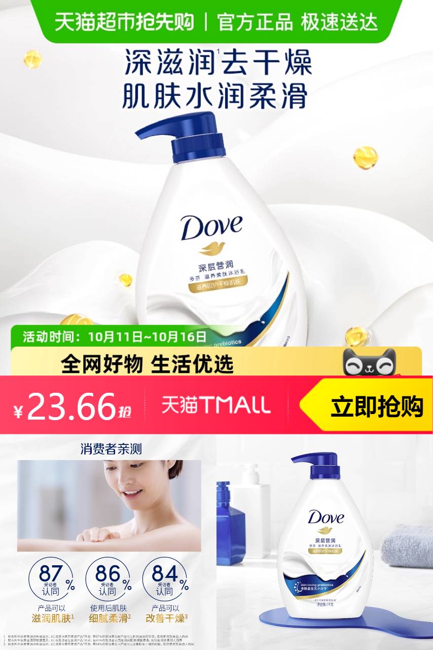 【叠加88立减1.35+1.99淘金币到手23.66,线下一瓶得40+】VIP抵淘币24.9到手!多芬深层营润沐浴露1000g装,挤一点就能搓出丰富泡沫,清洁力够但不刺激,洗完皮肤不发干、不假滑