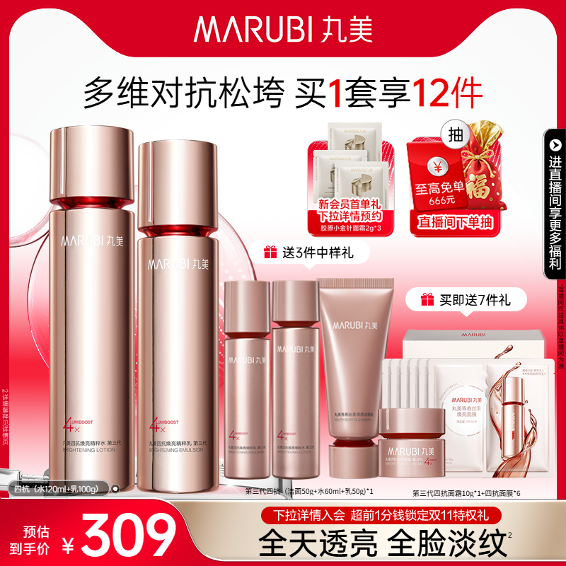 丸美旗舰店推出的全新护肤系列,包含三款产品:四抗水乳、四抗精华、四抗面霜,满足肌肤需求,帮助您在日常生活中保持佳状态。同时,该系列采用科学配方,有效对抗岁月痕迹,让您拥有年轻光彩。