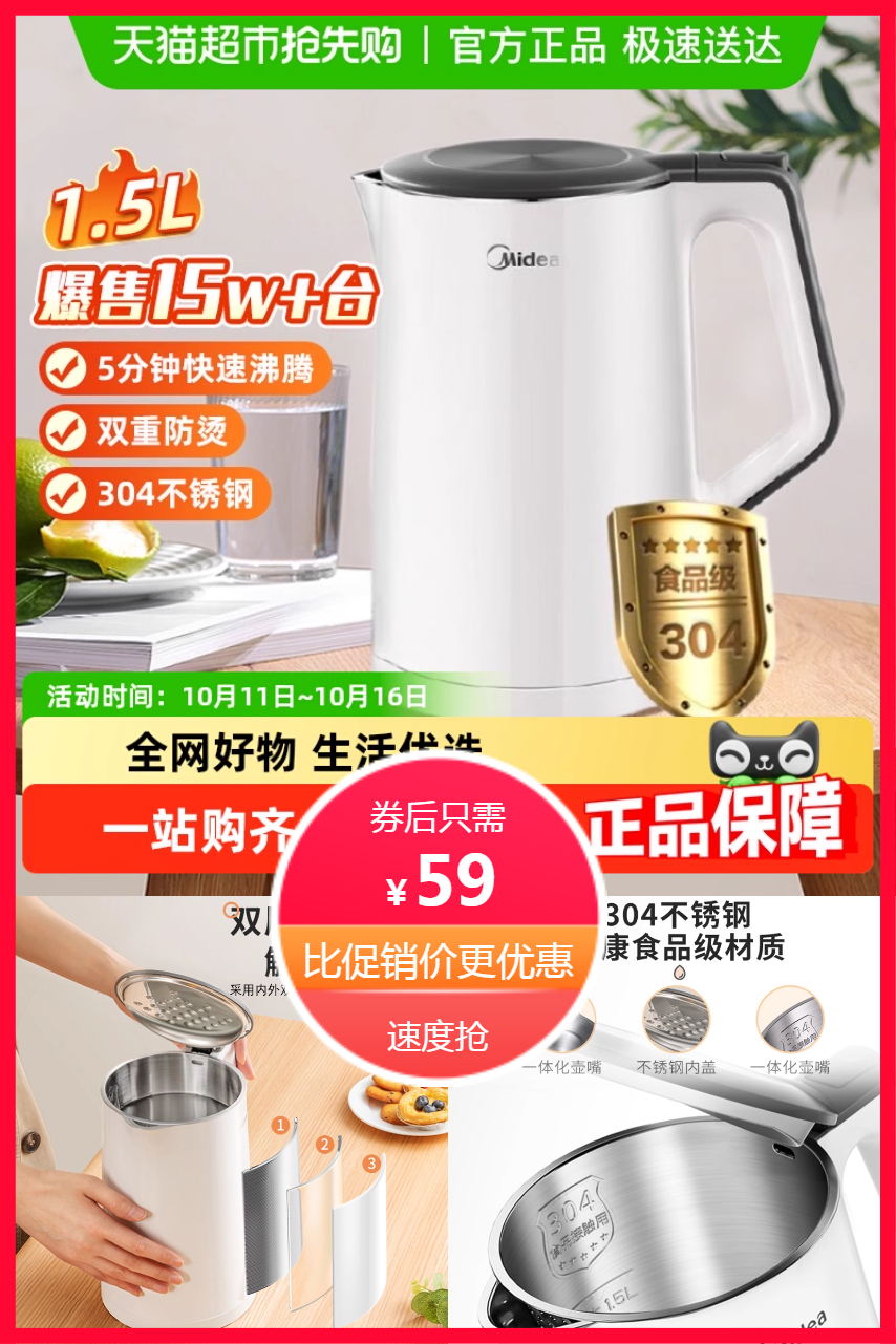 【淘金币到手约53元】美的电热水壶,1.5L小巧设计!304不锈钢内胆,健康耐用,自动断电更安全,家用烧水好帮手~高效速热,防烫手柄,性价比超高,品质生活从一杯热水开始~