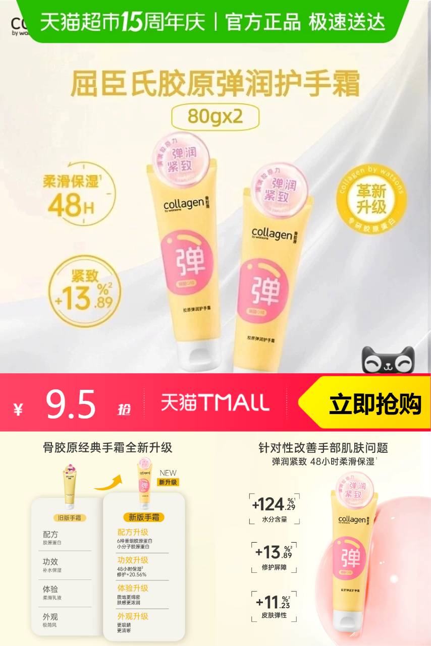 【下拉详情淘秒到手7.09两支,折一支3.5】屈臣氏骨胶原弹润护手霜80g*2,满满胶原,弹润“手”护。针对性改善手部肌肤问题,弹润紧致48小时柔滑保湿。协同科学成分,充盈弹力网,紧致细润。它的香味也超级好闻,淡淡的清香,让人心情愉悦。快来试试吧!