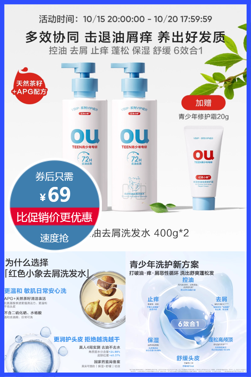 送青少年修护霜20g!定金10元,立减15元叠加劵尾款59元!红色小象控油去屑洗发水400g*2瓶,控油专利进阶B6,稳定皮脂腺 抑制油脂生成,舒缓红敏,强韧头皮屏障,止痒、去屑、保湿头皮清爽,发丝蓬松,高颅顶!
