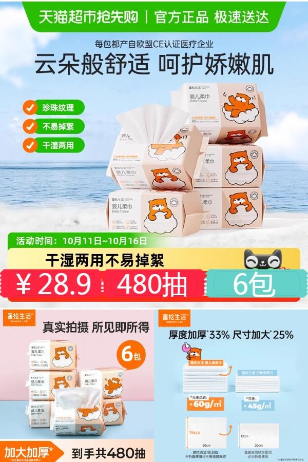 推荐:6包*80抽!蓬松生活云柔巾婴儿绵柔巾