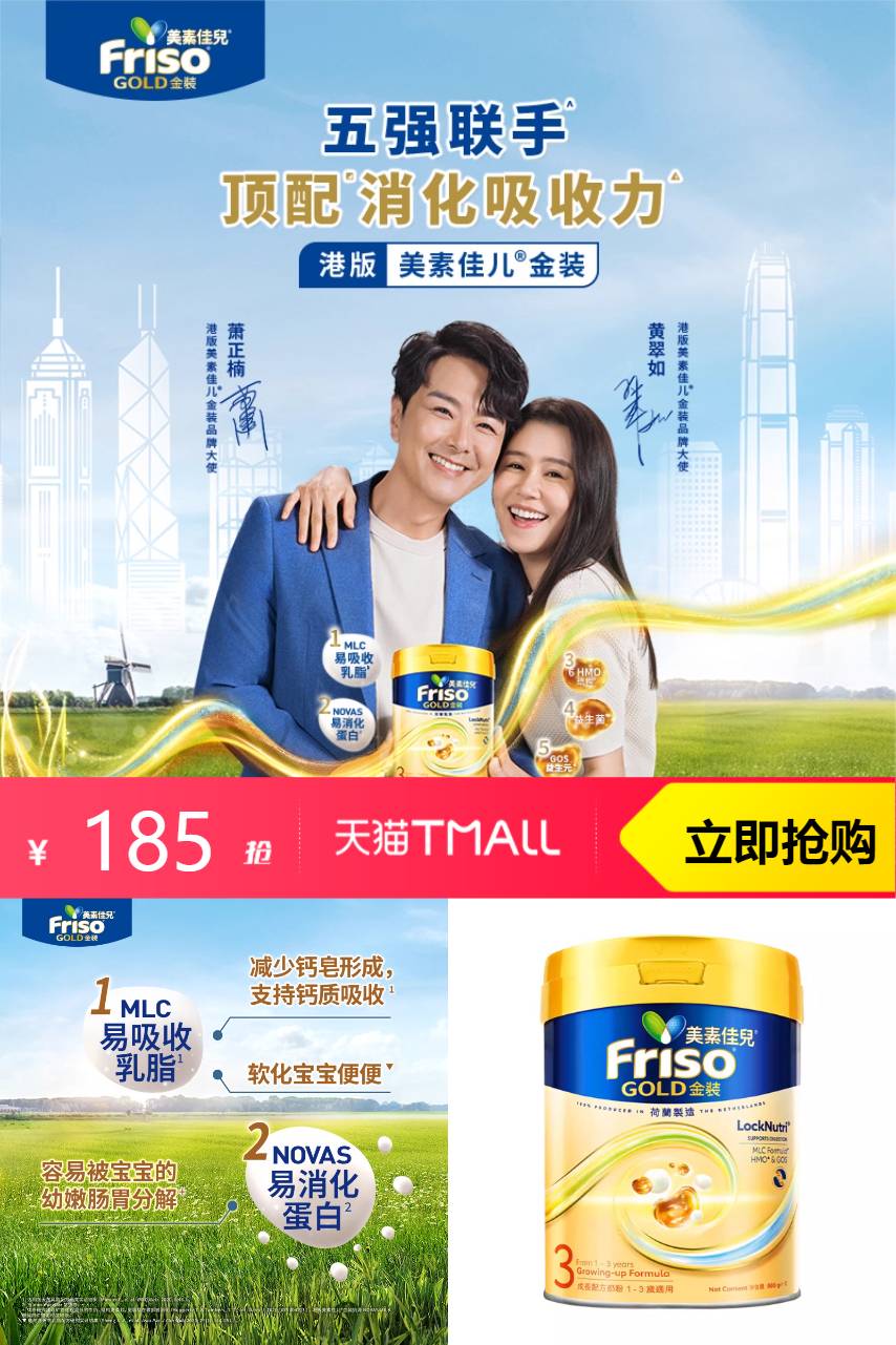 【优惠前249元-直降54元-10元券=185元到手含税 可叠加买返10元购物金=175元-淘金币9.96元=165.04元到手含税 满两件即赠牛牛围兜一件】Friso港版金装美素佳儿3段800g,突破升级五强联手,易消化 易吸收!