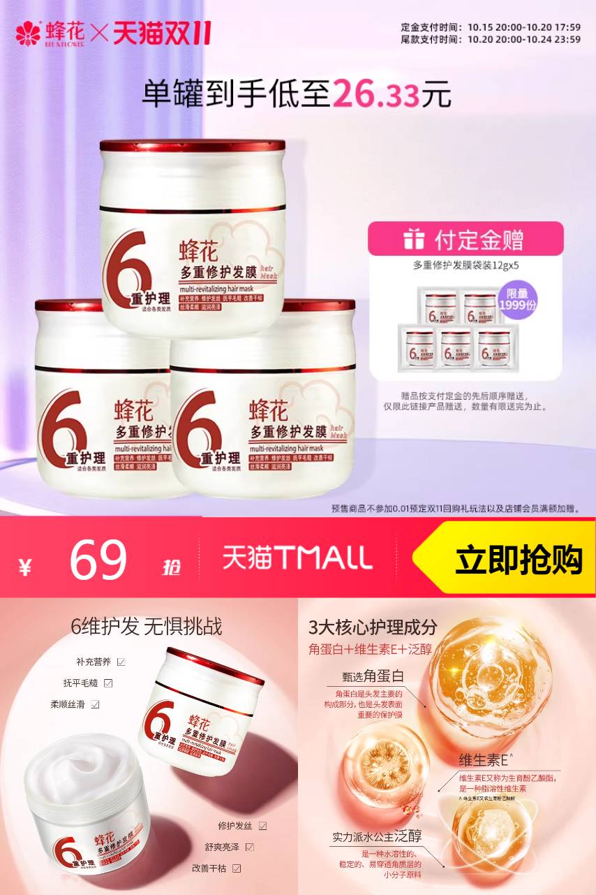 【付定金赠 多重修护发膜袋装12gx5 限量1999份】💎 产品亮点:蜂花发膜,集多重植物精华于一身。天然蜂蜜和珍稀花草萃取,富含丰富的营养成分,针对性地修复各种发质问题。独特的配方让你的发丝恢复柔软与光泽。